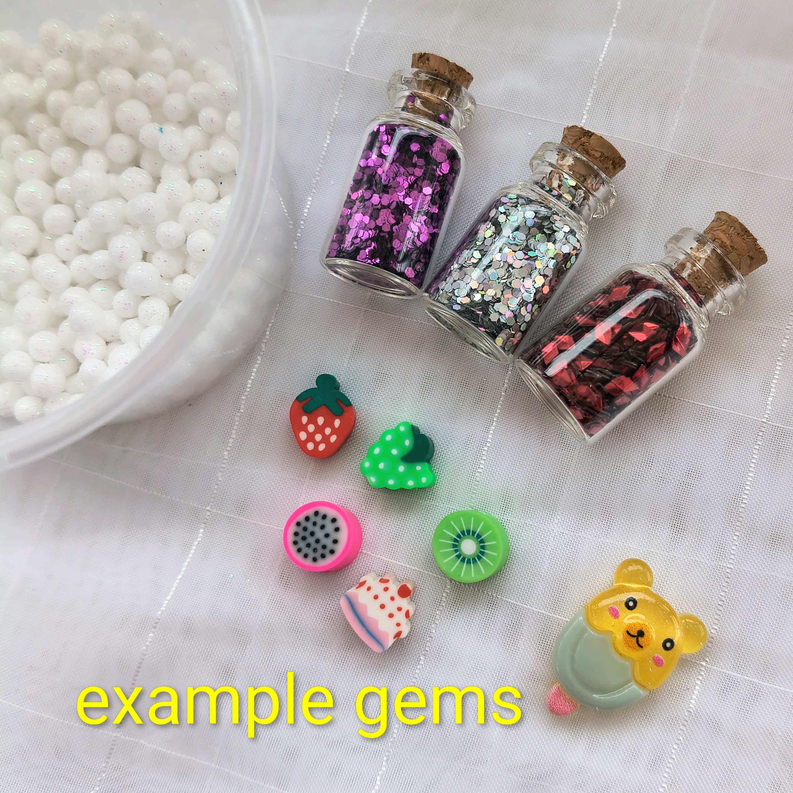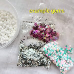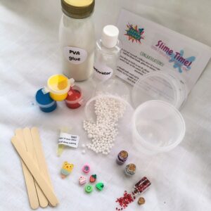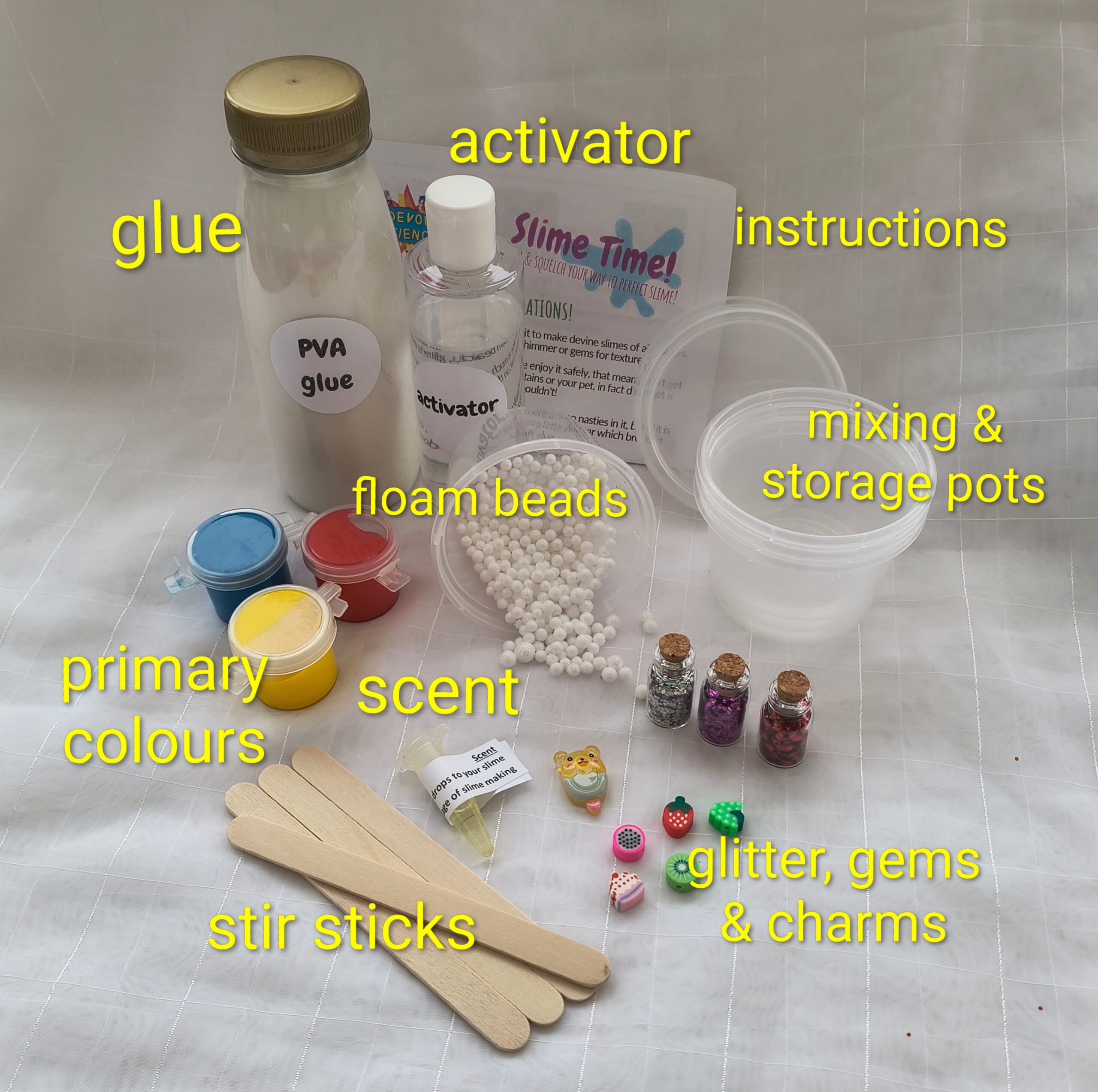 Contents: 200ml glue, activator, mixing/storage pots,  colourings, stirring sticks, vial of scent, floam beads, gems & glitter (these may differ from the photographs, but you’ll get a good bundle of embellishments), written instructions & links to online pre-recorded tutorials.