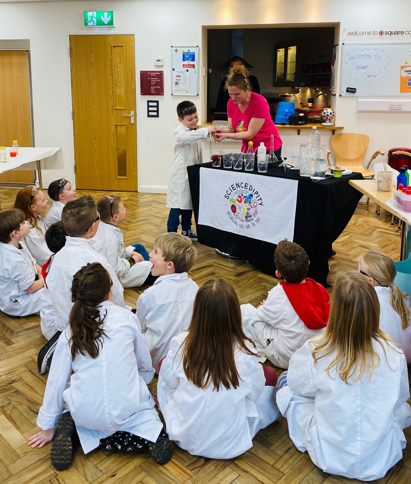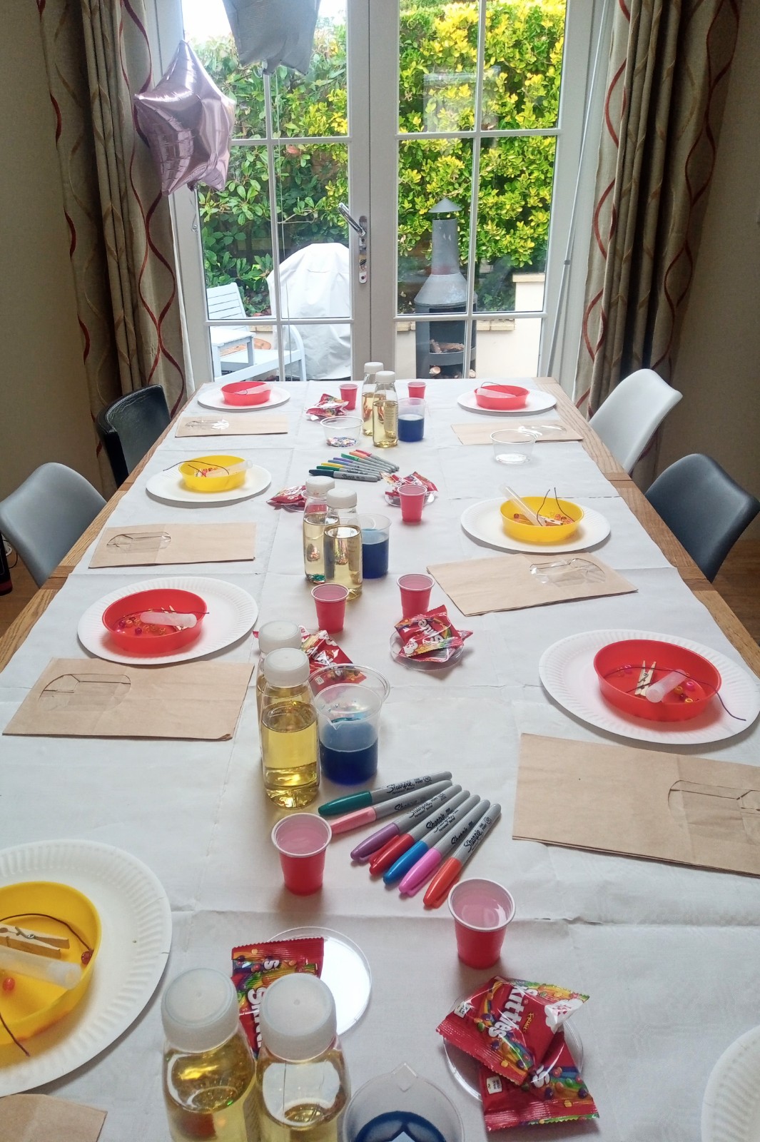 We’ll arrive at your venue about 30 minutes before the party start time, in order to set up our area plus the young scientists’ activities tables. Your venue can be your home (kitchen, conservatory or lounge!), garden or a hall/space you have hired.